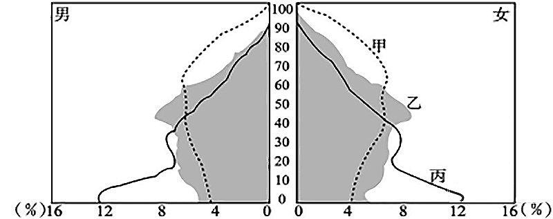 解析:本题考查人口相关问题,根据图片给出的信息推测得知:甲:出生率低,老年人口占比高,人口老龄化严重;乙:青壮年劳动力比重大;丙:青少年儿童占比高,出生率高。1956年的青少年,到了2006年步入老年,会使50岁左右的人口变的比较多,而到了2056年,将面临严峻的人口老龄化问题,故对应关系应该是1956→丙、2006→乙、2056→甲,故选B