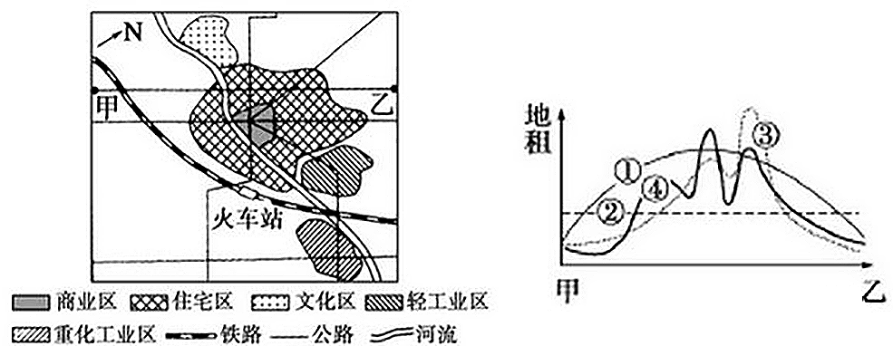 解析:本题对影响城市功能区分布的因素以及影响城市地租水平高低的因素进行考查,