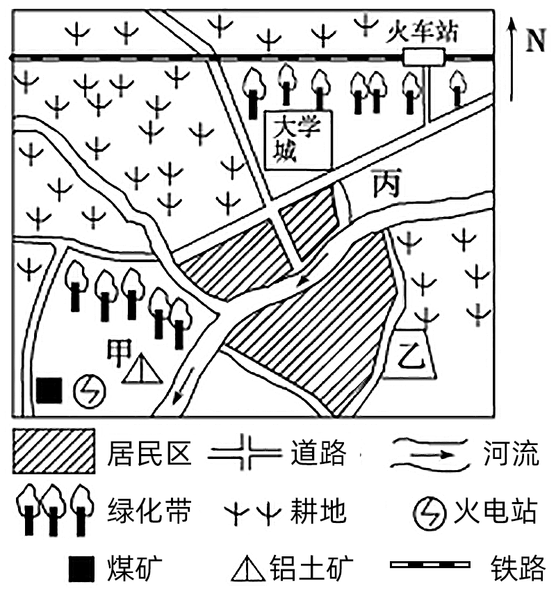 (1)炼铝(1分)、动力(1分)、附近有煤矿和火电站,能源丰富;(1分)、附近有铝土矿,原料丰富;(1分)、靠近河流,水源充足;(1分)、临近公路,交通运输便利;(1分)、处在与当地盛行风向相垂直的郊外,对城市环境污染较小。(1分)、(5点中答对4点即可得4分)