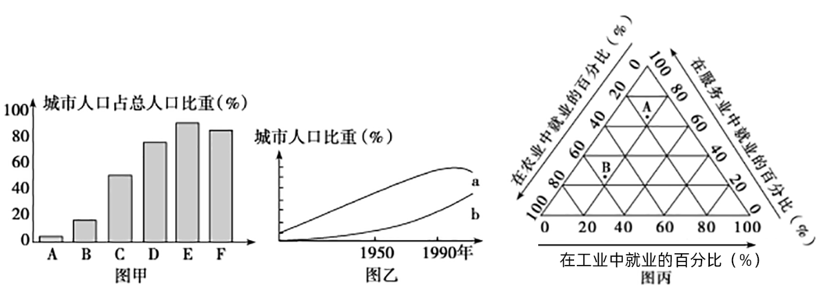 (3) 图丙中B类国家近年来大量农民涌入城市,主要原因是与城市相比,乡村有哪些缺点? (4分)