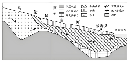 蒙新河狸是国家一级重点保护野生动物,在我国仅栖息于新疆准噶尔盆地乌伦古河(内流河)的河水与近岸。乌伦古河发源于阿尔泰山,近几十年来该流域农牧业发展迅速,蒙新河狸因栖息地减少濒临灭绝。调查表明,在乌伦古河干流河段,下游较上游蒙新河狸更为稀少。2018年以来,几名青年志愿者发起“河狸食堂”公益活动,克服当地自然条件的限制,在乌伦古河两岸种植河狸喜食的灌木柳。迄今为止,我国蒙新河狸的数量增加到约750只。如图示意乌伦古河干流下游河段水文地质剖面。