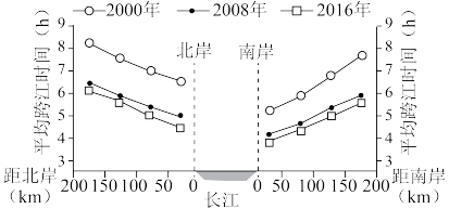 进入21世纪,长江下游跨江桥隧建设发展迅速。有研究统计,2000年长江下游公路跨江桥隧通道仅4条,2008年为9条,2016年增至17条。图示意这三个年份长江下游两岸部分市县距江岸不同直线距离区间的车辆,到达对岸所需平均时间的变化。据此完成下面小题。