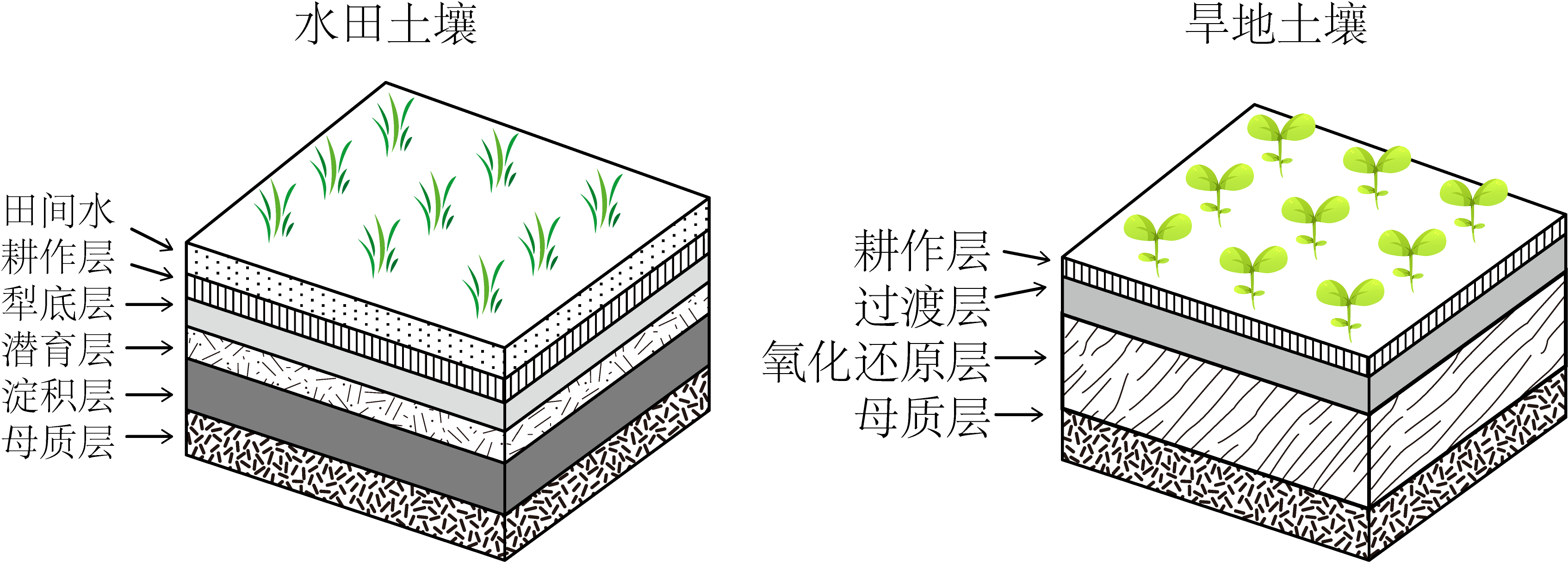 下图示意长江三角洲某地在相同母质、相邻地块上发育的水田土壤和旱地土壤剖面层次结构。据此完成下面小题。