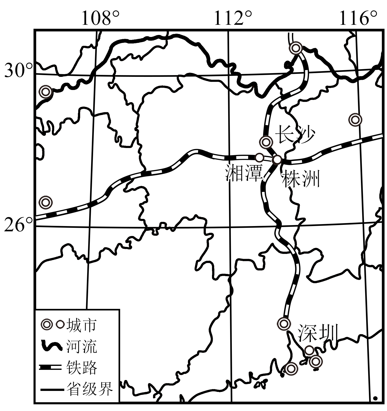 湘潭市是一座重要的钢铁工业城市。近年来该市积极转变发展思路,以“锰矿+锂云母”资源为基础,瞄准东部沿海地区新能源汽车及相关产业转移的机遇,通过“整车+电池+研发”全产业链布局,实施“链式承接”;同时与深圳高校共建异地联合实验室,将沿海地区研发成果在湘潭市孵化。下图示意湘潭市地理位置。