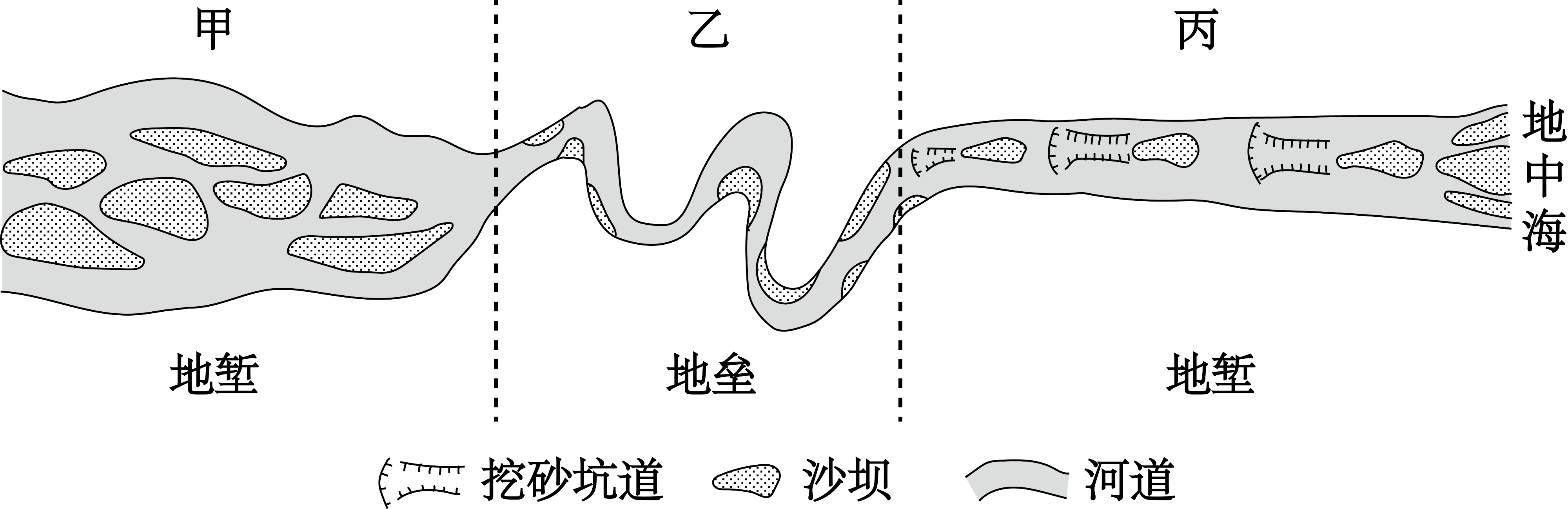 塞尔韦拉河是西班牙东部的季节性河流,全长44千米,中下游流经三个地质构造单元。下游河道因过去开采砂砾破坏严重,后来政府对开采行为进行了限制,河道缓慢恢复。下图示意该河流中下游甲、乙、丙三个河段的河道形态。据此完成下面小题。