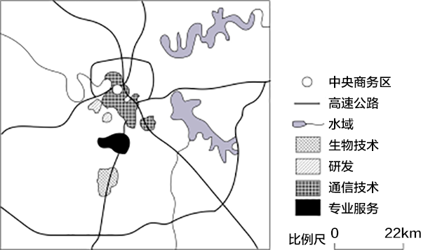 专业服务在美国属于高技术产业部门,为其他部门或消费者提供(咨询、法律、计算机等)专业知识与技术服务。通常,专业服务集聚分布于中央商务区。如图示意部分高技术产业部门在纳什维尔大都市区的集聚分布状况。据此完成下面小题。
