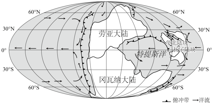 板块运动影响下的海陆格局对大气环流和自然资源等的形成有重要作用。研究表明,古生代晚期,冈瓦纳大陆和劳亚大陆拼合形成一个跨越南北半球的超级大陆,大陆东侧为特提斯洋。冬、夏季两半球陆—陆间热力差异驱动当时的季风环流。下图是超级大陆地理格局复原图,当时地球的质量、体积、运动状况与现在差异不大。