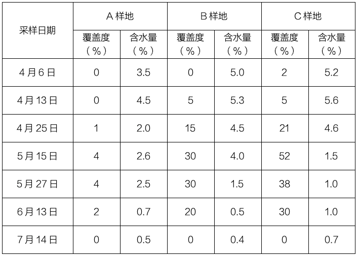 (1)某同学准备在同一坐标图中绘制 A、B、C 三个样地覆盖度与含水量折线图,在绘制了A样地折线图(下图)后,发现其中一条折线存在错误。请指出错误之处。(4 分)