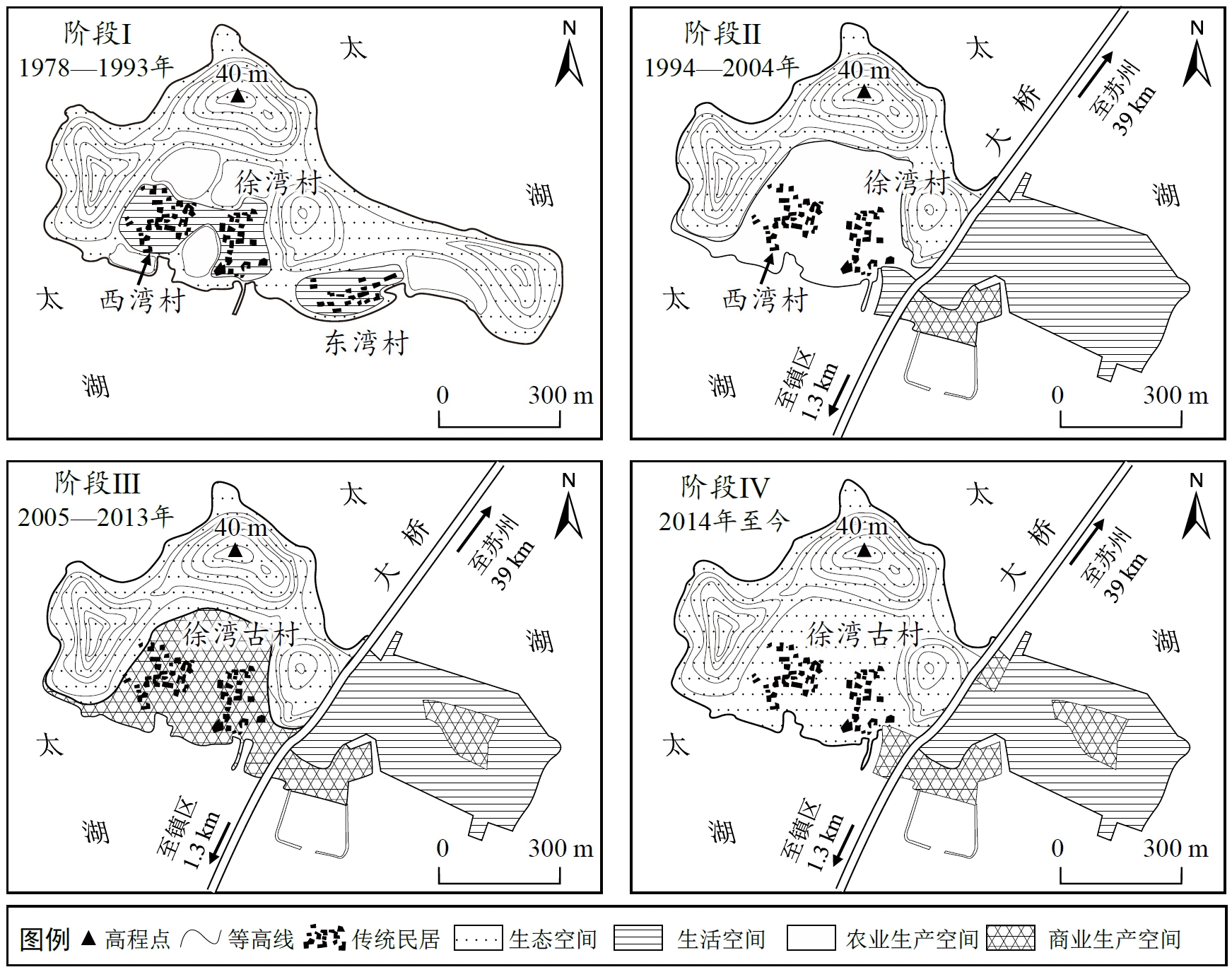 叶山岛位于太湖东南水域、南宋末年就有村民在该岛定居;至清代,岛上居民已达百余家,村民以渔、农为业,皆会唱曲。20世纪90年代以来,随着该岛被纳入太湖国家旅游度假区以及徐湾古村被列入苏州市第一批传统乡村名录,当地居民的生活、生产空间发生了显著改变。近年来,当地政府利用古村落和传统戏剧文化资源发展文旅产业,下图示意1978年以来叶山岛生活、生产和生态空间的变化过程。