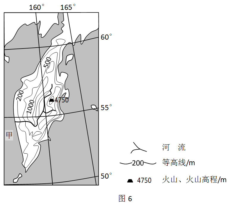 某科考队8月考察堪察加半岛,考察中发现,勘察加半岛北部发育苔原,南部生长森林;东西向气候区域差异显著;大型植食性和肉食性野生动物数量较少,但冬眠杂食性且善捕鱼的熊的数量较多;大量来自海洋的鲑鱼溯河流而上,成为熊的重要食物。图6示意勘察加半岛的地形。
