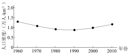 发展较成熟、规模和结构相对稳定的大都市区,空间上通常表现出较明显的圈层结构。下图示意1960—2010年某大都市区核心圈层(距老城中心5千米范围内)的人口密度变化。据此完成下面小题。