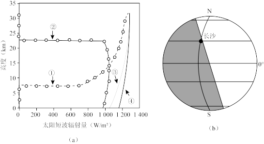 2019年5月28日,某科研团队利用往返式探空气球,在长沙观测站(28°07′N,112°17′E)收集了四个不同时刻释放的气球所记录到的太阳短波辐射量变化信息(图a)。图b为其中某一时刻对应的太阳光照示意图(阴影部分代表黑夜)。据此完成下面小题。