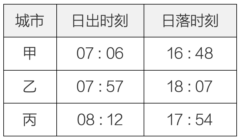 下表为我国三个城市2024年12月某日的日出日落时刻(北京时间)。据此完成下面小题。