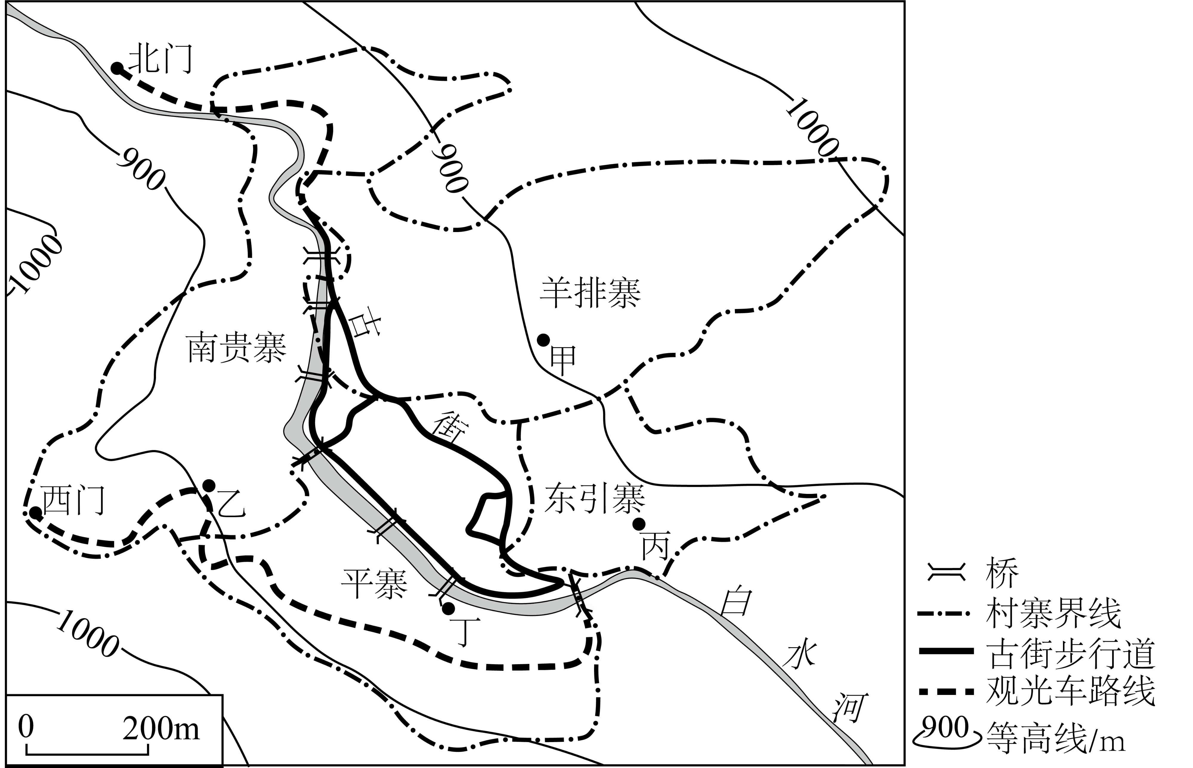 贵州西江苗寨(如图)是我国现存最大的苗族聚居地,白水河东岸保存着较为完好的苗族传统聚落。20世纪末旅游活动兴起,至2005年,服务业多集中于古街沿线。2009年旅游全面开发后,白水河西岸村民纷纷重建房屋,逐步形成了商住一体的仿吊脚楼聚落景观。据此完成下面小题。