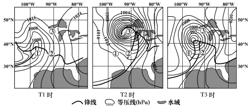 下图示意某年11月10日0时、9时和18时的北美洲局部区域海平面气压和锋面位置。据此完成下列问题。