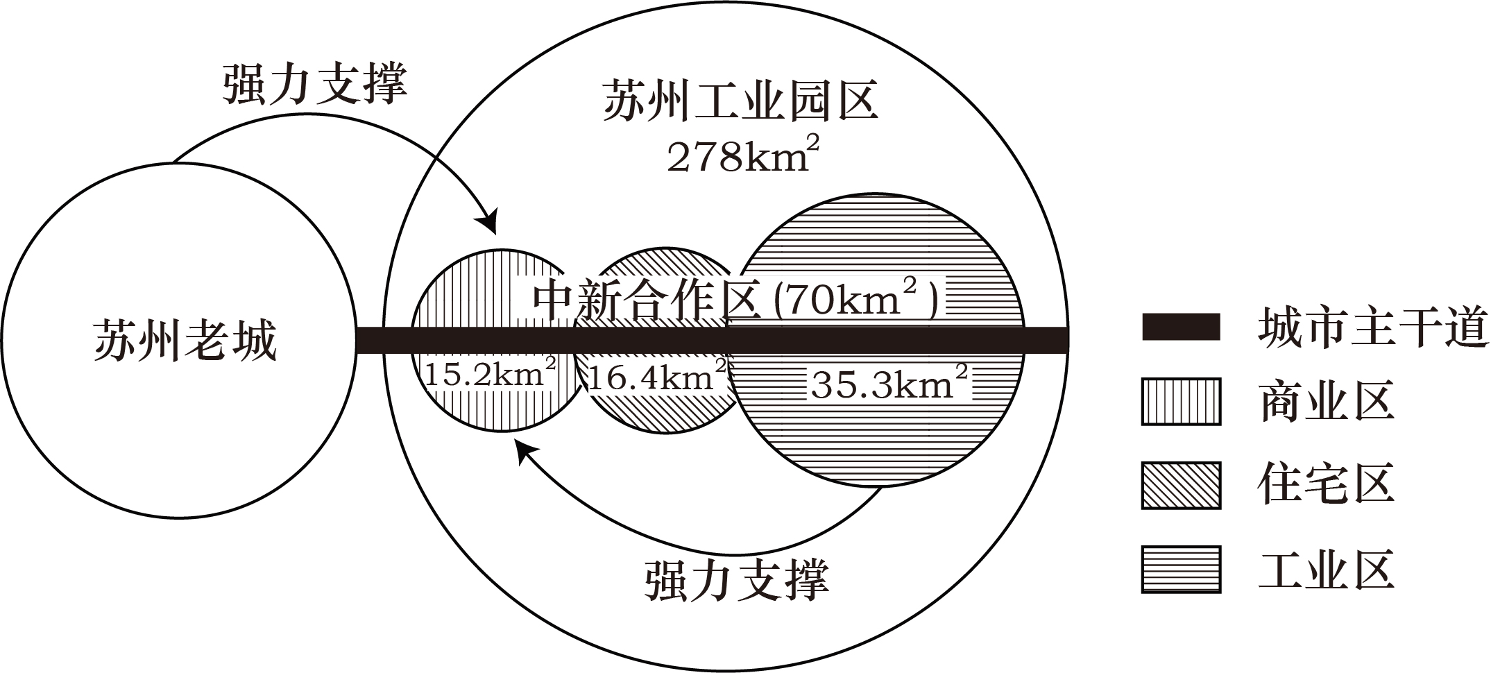 苏州工业园区是中国和新加坡两国政府间的重要合作项目。图 1 示意苏州工业园区中的中新合作区 1994-2000 年实施的功能区布局规划。规划思路是通过基础设施建设,优先开发工业用地;当人口集聚到一定规模后,加大开发居住用地;当人口进一步集聚后,再重点开发商业用地。据此完成下面小题。