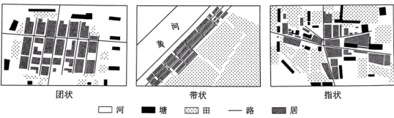 黄河三角洲村落空间形态具有明显的水适应性特征。在“河、塘、田、路、居”五因子的数量、分布等长期影响下,黄河三角洲的村落表现出团状、带状、指状3种典型空间形态。图1为黄河三角洲典型村落分布图。图2示意黄河三角洲村落空间形态。据此完成下面小题。